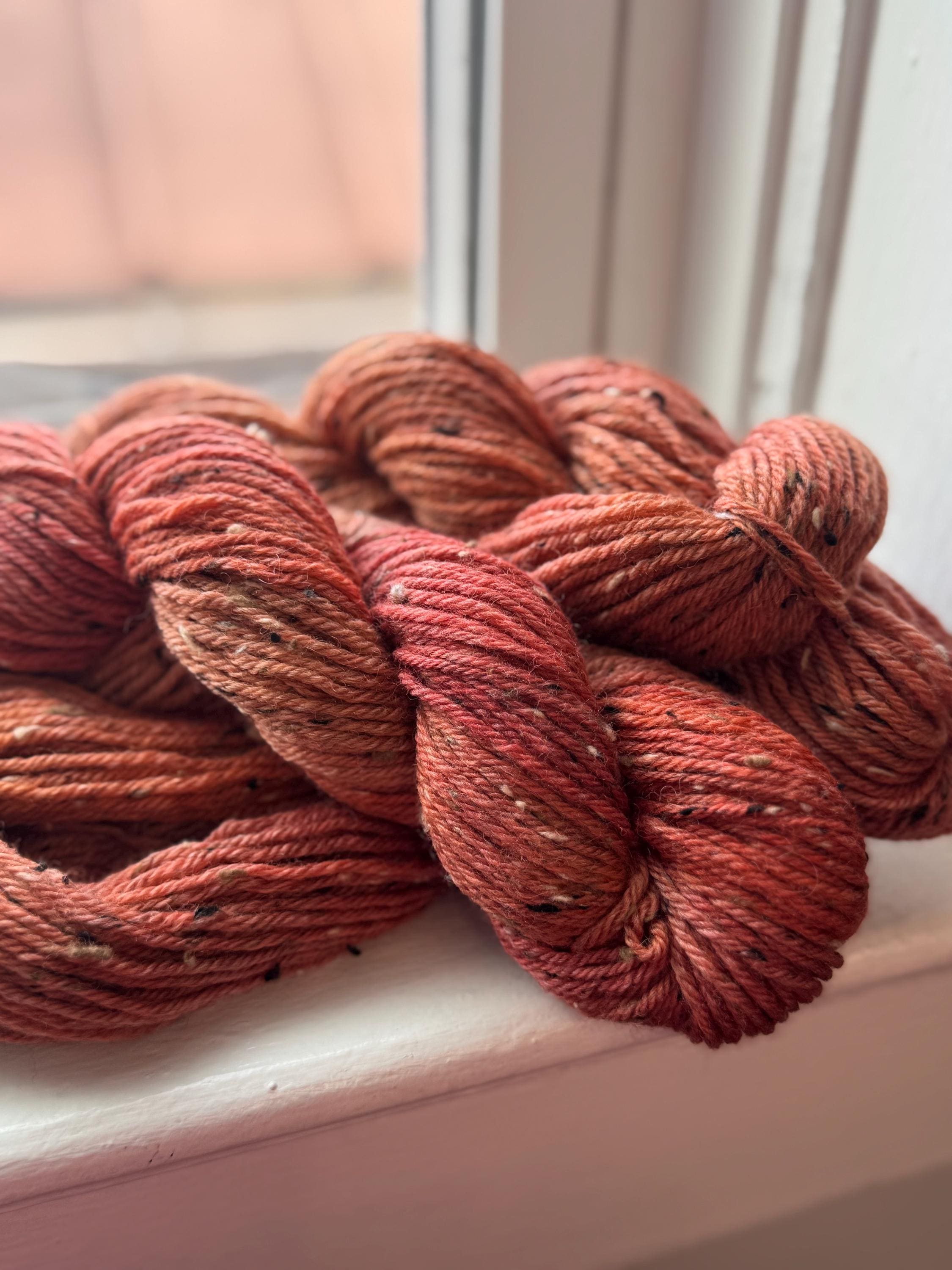 Inspired by the warm, earthy tones of Kentucky’s red clay, this burnt orange colorway glows with rustic charm. Kentucky Clay is hand dyed in small batches, allowing Donegal tweed flecks to pop beautifully against the rich base color.
